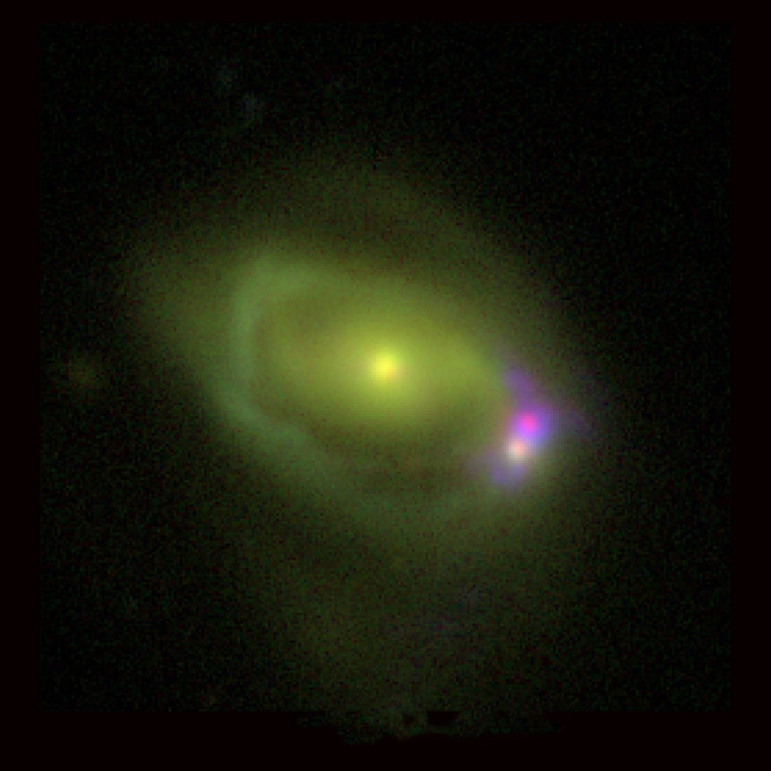 در این تصویر یک کهکشان دیسکی بزرگ در حال ادغام با یک کهکشان کوتوله است. کهکشان کوچکتر، میزبان یک سیاه چاله بسیار بزرگ است که باعث می شود جرم آن 2 درصد بالاتر رود. انتظار میرود که ادغام با کهکشان بزرگتر، کهکشان سیاه چاله ای در چند صد میلیون سال داشته باشد. (ناسا)