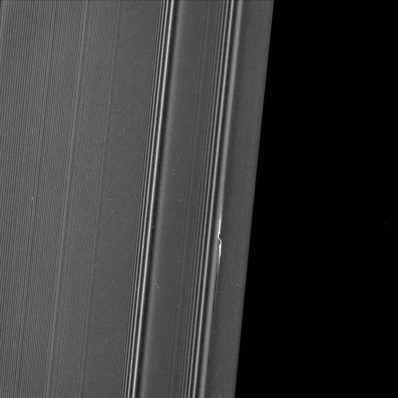 این تصویر یک پروانه ملخی (مشابه ملخ هواپیما) و یا اختلالی در یک حلقه زحل را نشان میدهد که ناشی از یک قمر کوچک است. (ناسا)