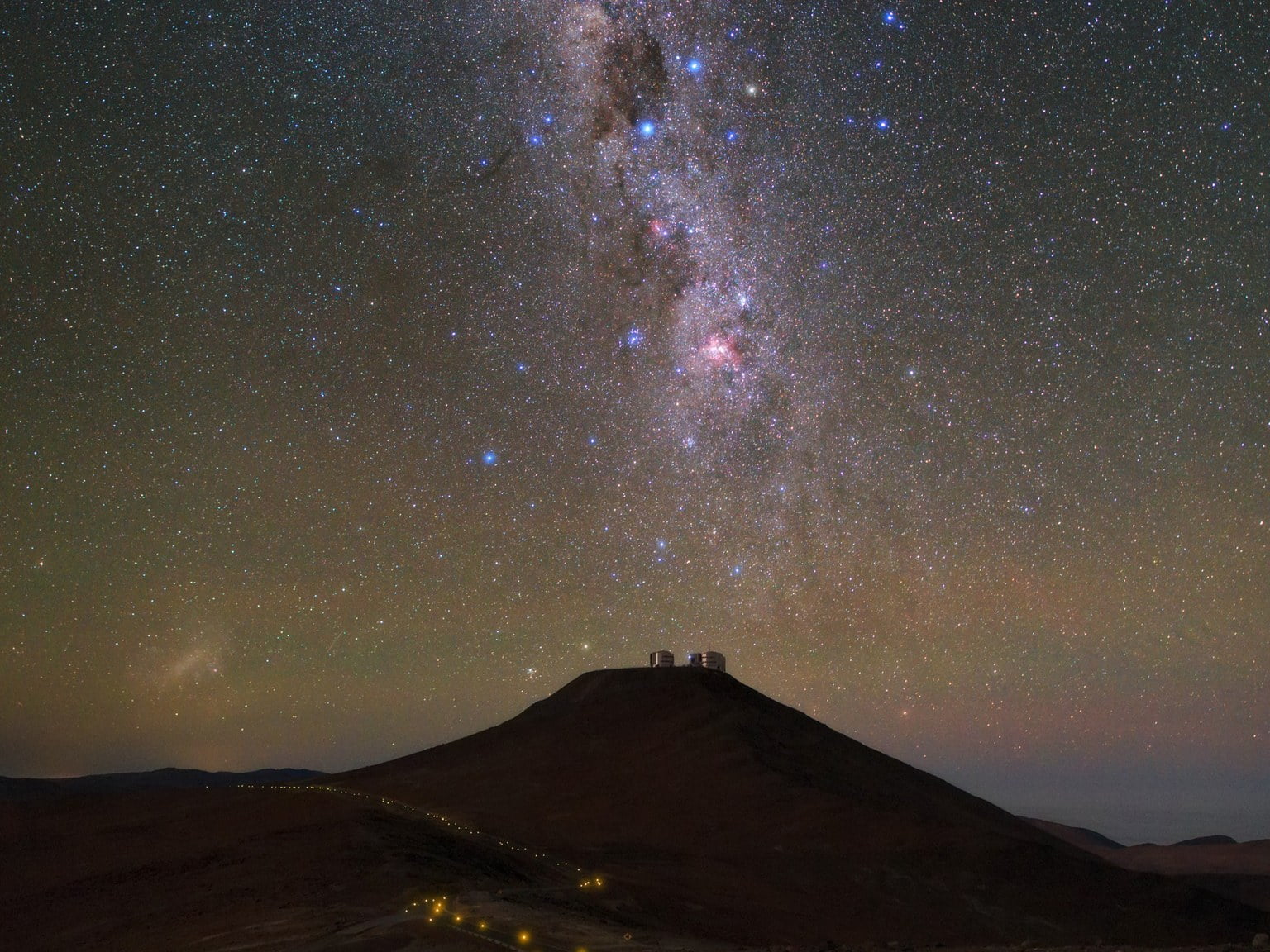 در این عکس تلسکوپ بسیار بزرگ ESO، پایین تر از کهکشان راه شیر قرار کرفته است. برآمدگی کهکشانی مملو از ستاره در سمت بالای تصویر به وضوح قابل مشاهده است. (ESO)
