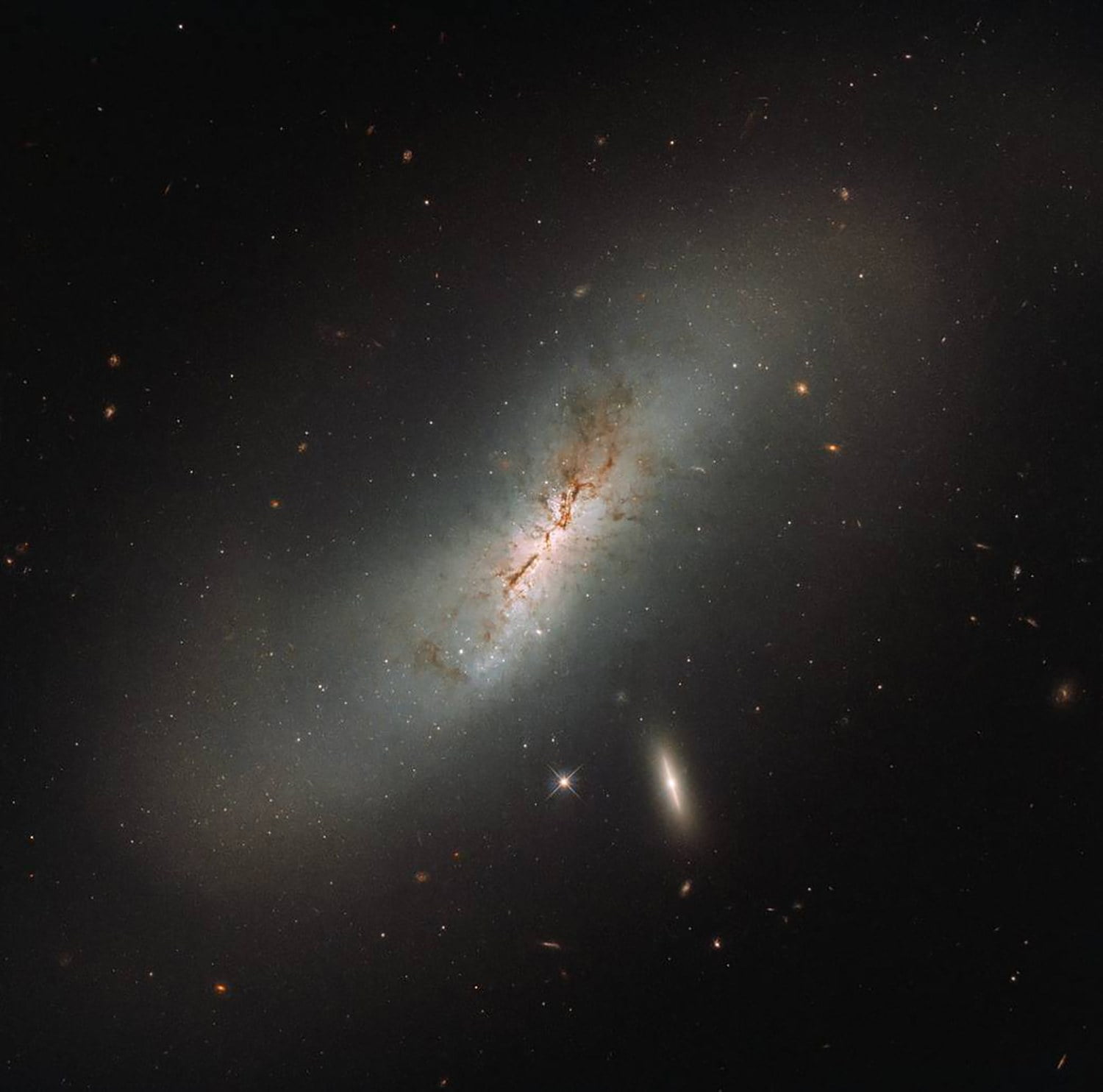 این عکس توسط تلسکوپ فضایی هابل گرفته شده است و دو کهکشان را نشان میدهد: NGC 4424 و کهکشان مسطح کوچکتری که زیر آن قرار گرفته است و LEDA 213994 نام دارد. (عکس از ESA)