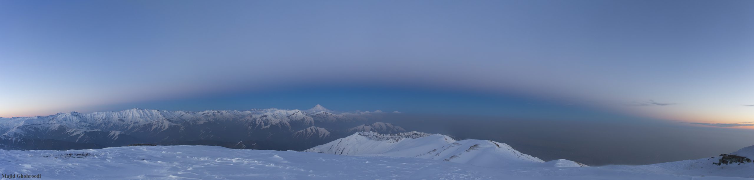 از میان آسمان روشن کریستالی و صاف، این تصویر پانورامای زیبا سایهی منحنی سیاره زمین را که در حال پیشروی به بالای زمین است دنبال میکند. چشم انداز گرگ و میش وسوسه انگیزی که از ترکیب هشت فریم جداگانه در ارتفاع 4000 متر بالای سطح دریا در 6 آپریل ساخته شده است. درست در بالای مرز خاکستری زمین و سایه، قوس محو و با رنگی متمایل به صورتی، ضد شفقی جای گرفته است. این قوس که به عنوان کمربند زهره شناخته شده است، نوار سرخ رنگی است که در اثر پراکندگی نور خورشید در اتمسفر در هنگام طلوع و غروب با آسمانی آبی پیوند میخورد. در مرکز تصویر در راستای امتداد خط ناهموار افق، قله دماوند در میان رشته کوه البرز پوشیده از برف استوار ایستاده است. دماوند که یکی از نمادهای خاص در اسطوره شناسی و ادبیات فارسی است، با 5610 متر ارتفاع بلندترین قله در ایران و خاورمیانه است.