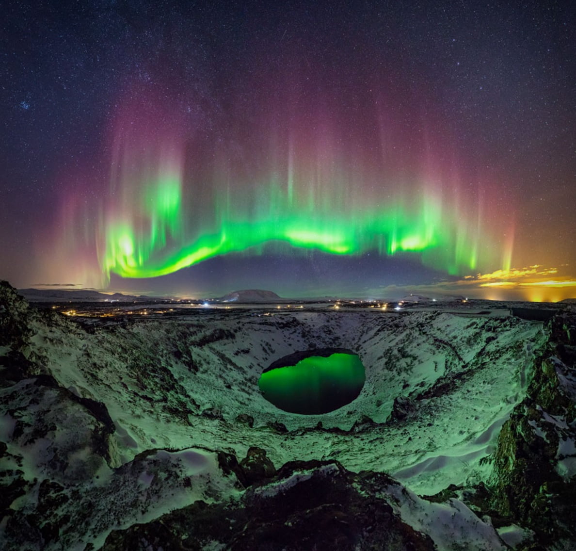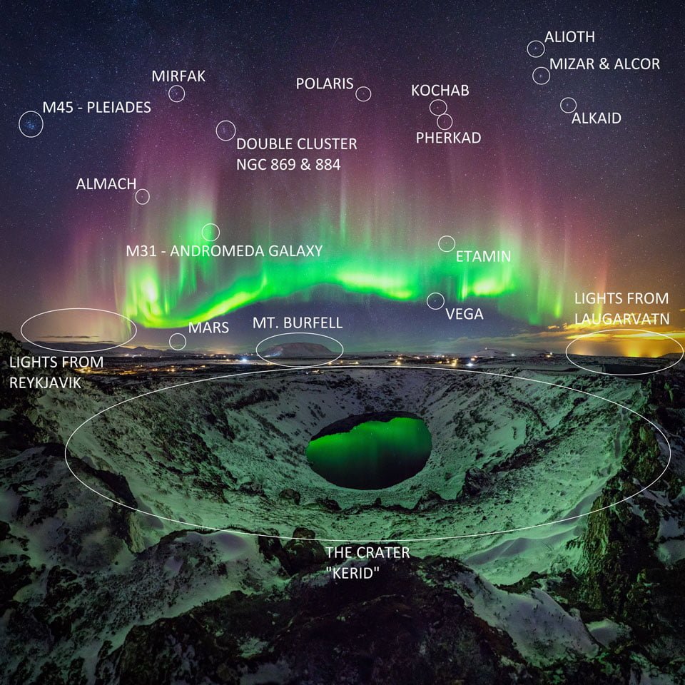 شما زمانی که به کوهنوردی در آتشفشان های باستانی میروید، با چنین صحنهی زیبایی روبرو نمی شوید. در واقع باید خیلی خوش شانس باشید. وقتی که ویلیام، عکاس نجومی دو هفته پیش متوجه شد که شفق قطبی قابل رویت است، شبانه خود را به بالای دهانه رساند تا بتواند شفق قطبی را از آسمان و انعکاس آن را در دریاچه مرکزی شکار کند. در قله کوه او متوجه شد که نورهای شمالی بسیار روشن تر و قابل توجه تر از قبل است. او این تصویر را از کنار هم قرار دادن 13 عکس پانوراما ساخته است. دریاچه ای که در مرکز تصویر است کرید (Kerid) نام دارد و 3000 سال قدمت آن است. این شفق رنگ های تأثیرگذار و زیبایی سبز و قرمز را در بالای جو زمین نشان میدهد. در تصویر پس زمینه آسمان، ستاره قطبی، خوشه پروین و دب اکبر قابل مشاهده است.