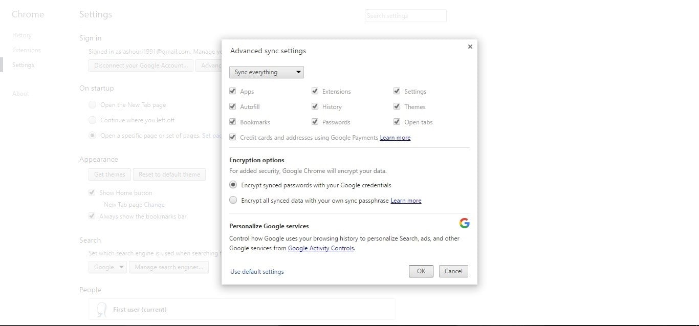 وقتی که شما جی میلتان را به کروم متصل میکنید، تمام بوک مارک ها، تاریخچه مراجعه به صفحات وب مختلف و تمام پسورد هایی که در کروم ذخیره کرده اید در آن ذخیره میشود و به راحتی روی تمام دستگاه های مختلفی که مرورگر کروم نصب باشد میتوانید این اطلاعات را داشته باشید. وقتی شما اکانت گوگل تان را در کروم وارد میکنید همزمان وارد جیمیل خود، یوتیوب و دیگر سرویس های گوگل خود شده اید.پس از وارد کردن حساب کاربری گوگل، در صفحه setting گزینه ای با عنوان Advanced sync settings ظاهر میشود که شما به وسیله آن قادر خواهید بود که تنظیمات همگام سازی مرورگر کروم خود را انجام دهید. برای مثال اگر شما در مرورگر کروم رایانه شخصی تان، برخی سایت ها را بوک کارک کرده اید و میخواهید این بوک مارک ها را در رایانه دوستتان نیز داشته باشید، به وسیله این گزینه قادر خواهید بود تنها بوک مارک ها و نه اطلاعات دیگرتان را در مرورگر کروم دوستتان وارد کنید و بعد از خارج کردن حساب کاربری خود اجازه دهید که بوک مارک ها در مرورگر کروم دوستتان باقی بماند. این تنها یک مثال ساده بود، بدون شک اگر به صورت حرفه ای با این مرورگر کارد کنید، ازکارایی های دیگر این گزینه استفاده خواهید کرد. همان طور که در تصویر زیر مشاهده میکنید، شما قادر خواهید بود گزینه های مختلفی را برای همگام سازی مشخص کنید.