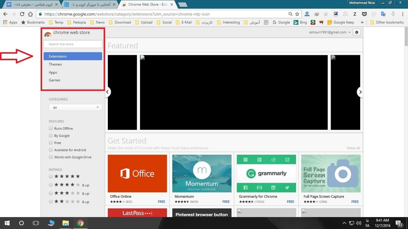 در تصویر بالا که نشان دهنده نمای کلی وب استور مرورگر کروم است، درکادر مشخص شده چهار کلمه نوشته شده است که شامل بخش هایی است که از آنها در مرورگر کرومتان میتوانید استفاده کنید: