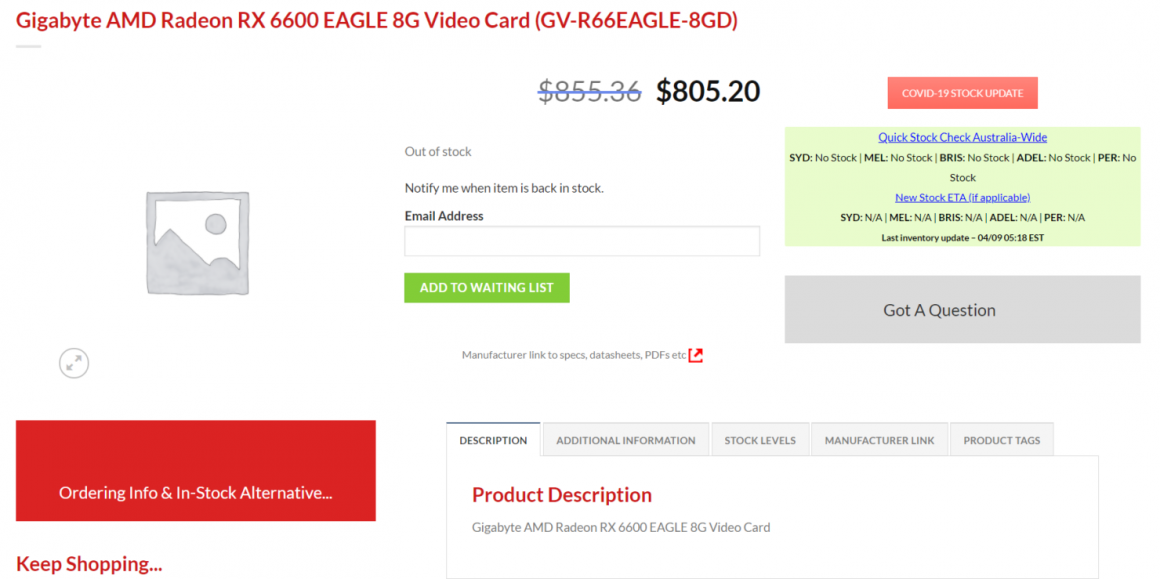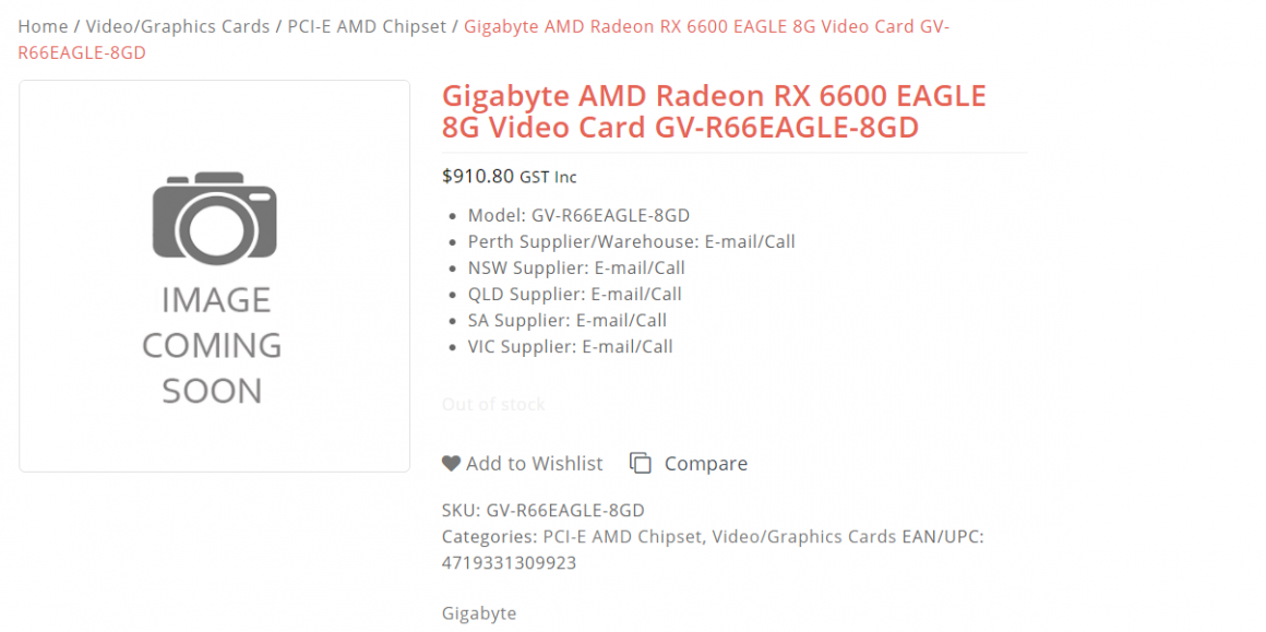 قیمتهای متفاوتی در این فروشگاهها در نظر گرفته شده جایی که ارزانترین 805 دلار استرالیا (600 دلار) تا گرانترین 951 دلار استرالیا (710 دلار) در Inell میباشد. میانگین قیمت لیست شده 900 دلار استرالیا یا 671 دلار آمریکا میباشد. Computers Perth مدل ASUS ROG STRIX RX 6600 XT را با قیمت 1065 دلار استرالیا یا 794 دلار قرار داده که یعنی RX 6600 بالغ بر 260 دلار استرالیا یا 194 دلار ارزانتر از نمونه XT خواهد بود. البته در نظر داشته باشید که کارت ایسوس یک مدل بالا رده است اما سری Eagle گیگابایت معمولا ارزان قیمتتر هستند. متأسفانه اما هیچ کدام از خرده فروشیهای مذکور مدل Radeon RX 6600 XT Eagle را موجود ندارند.