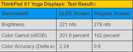 نمایشگر LCD،موفق به پوشش 102% از استاندارد SRGB شده و شدت روشنایی آن نیز به طور میانگین 279 نیت است.دقت دلتا که با نام Delta-E نیز شناخته می شود،در این LCD به رقم 0.6 رسید.اینک اما نوبت به نمایشگر OLED رسید؛این نمایشگر تا 201.9%درصد از استاندارد SRGB را پوشش می دهد و البته شدت روشنایی با مقداری کاهش به حداکثر 221 نیت می رسد.دقت رنگ دلتا نیز به طور جالب توجهی بالاتر از نمایشگر LCD بوده و عدد 2.24 را نشان می دهد.شفافیت و طبیعی بودن رنگ ها در پنل OLED،ادیتورها را مجذوب خود کرده است.آنها در عمده تست های خود از ویدیو هایی با دقت FHD اما با بیت ریت بالا استفاده کرده اند.شفافیت بالا،فاصله کم پیکسل ها و دقت بیش از 2K نیز از جمله ویژگی های این نمایشگر بوده است.شایان ذکر است که لنوو در سری جدید لپ تاپ های Workstation خود نیزا ز نمایشگرهای OLED استفاده خواهد کرد.