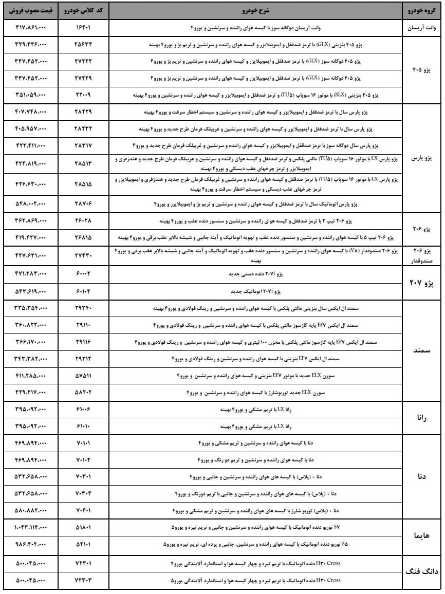 در توضیحات این لیست اعلام شده که کلیه مبالغ بر حسب ریال است و قیمتی محصولات در این لیست، دقیقاً مطابق با سیستم فروش و بر پایه مصوبات شورای رقابت، مصوبات کمیسیون فروش و با مکاتبات تأیید شده درج شده است.