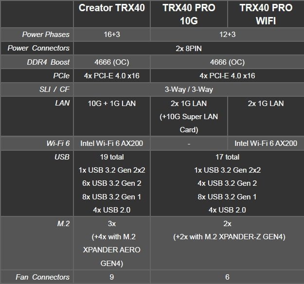شرکت MSi سه مادربرد را با چیپست TRX40 برای پردازندههای رایزن تریدریپر نسل سوم تدارک دیده است که در جدول زیر مشخصات اصلی آنها به منظور مقایسه با یکدیگر قید شده است.