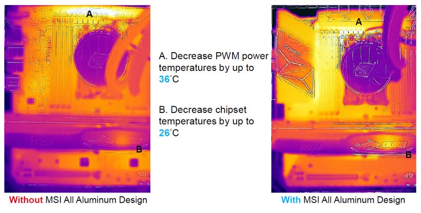 در مقایسه با مادربردهای X399، اماسآی برای مادربردهای تمام تلاش خود را برای تعبیه یک سیستم خنک کننده کارآمد به کار بسته کاربران بتوانند بدون نگرانی از تمام قدرت این مادربرد و پردازندههای رده بالای AMD بهره مند شوند. طراحی تماما آلومینیومی مادربردهای TRX40 این شرکت به همراه هیت سینک بزرگ برای پوشش I/O برای افزایش سطح انتقال حرارت در نظر گرفته شده است. علاوه بر این، لولههای حرارتی افزایش یافته و هیت سینک کارآمد برای مادربرد TRX40، متنفرق شدن بهتر حرارت را به دنبال دارد که موجب پایداری و عملکرد بهتر مادربرد میشود. هیت سینک Frozr تعبیه شده برای این مادربرد دارای یک فن با بلبرینگ دوگانه است که اماسآی عمر 50 هزار ساعته آن را تضمین میکند. همچنین این فن با برخورداری از فناوریهای Propeller Blade و Zero Frozr نه تنها شدت جریان باد بیشتری را نویز کمتری تولید میکند بلکه قادر به تنظیم کنترل خودکار سرعت فن نیز می باشد. با تمامی فناوریهای خنک کننده تعبیه شده برای مادربرد TRX40 اماسآی، دمای PWM و چیپست چیزی حدود 30 درجه خواهد بود که دمای بسیار خوبیست.