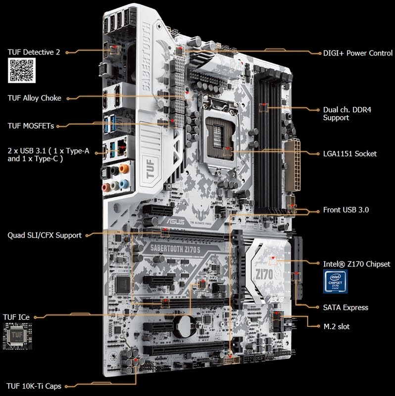 این مادربرد به گارد حفاظتی TUF ESD Guard 2 مجهز شده است.این قابلیت مادربرد را از شوک های الکتریکی مصون می دارد. TUF LANGuard نیز ویژگی محافظتی مشابه در زمینه شبکه است.6 درگاه USB 3.0 و 6 درگاه نسل سوم ساتا از جمله راه های ارتباطی این محصول هستند.اگر نیازمند استفاده از ذخیره سازهایی با سرعت بالا هستید،ایسوس آن را از طریق رابط M.2 در اختیار شما گذاشته است.مادربرد SABERTOOTH Z170 S به تراشه صوتی Realtek ALC1150 8-Channe مجهز شده و به لطف تقویت کننده این قسمت،صدایی با کیفیت از آن خارج می گردد.مادربردهای سری TUF اولین محصولات ایسوس در این زمینه هستند که از مادربردهای کاملا سفید بهره می برند.مدار چاپی آنها به طور یکدست به رنگ سفید درآمده و طراحی زیبایی دارد.ایسوس برای تکمیل زیبایی آن از فناوری Q-LED نیز استفاده کرده است که البته وظیفه دیگر آنها نمایش وضعیت بوت است.سامانه Thermal Radar 2 دارای 11 کانکتور مختلف برای قسمت متفاوت فن ها است. برنامه TUF Detective 2 نیز قابلیت کنترل مادربرد از طریق گوشی های هوشمند و تبلت را امکان پذیر کرده و قابلیت های عیب یابی را افزایش می دهد.