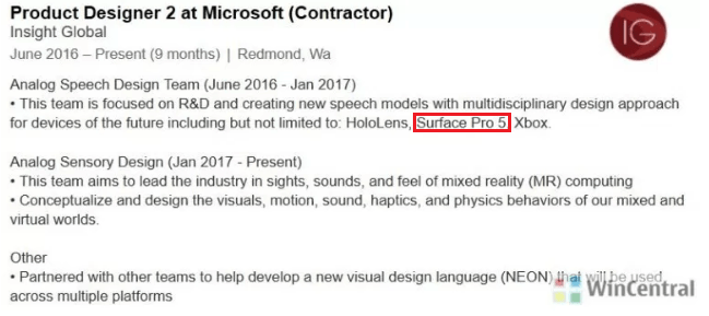 همچنین در کنار تصویر تبلت، نام سرفیس پرو 5 نیز در پروفایل Linkedln یکی از کارمندان مایکروسافت دیده شده است. همچنین به نام Neon نیز در این بخش اشاره شده است. Neon اسم رمز پروژه ی جدید مایکروسافت برای ویندوز 10 است که ظاهر این سیستم عامل را به طور اساسی تغییر میدهد.