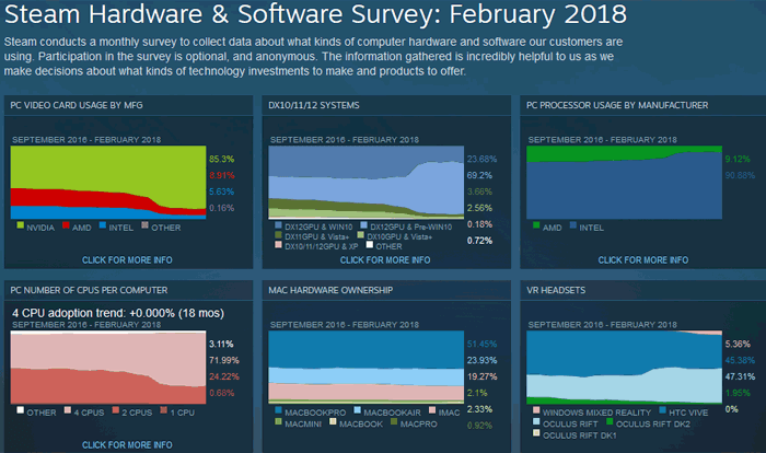 در بخش سخت افزارهای واقعیت مجازی، HTC Vive همچنان محبوب ترین انتخاب کاربران هستند. هر چند که هنوز 85.3% از گیمرهای استیم از کارت گرافیک های NVIDIA استفاده می کنند، اما کارت گرافیک های AMD نیز یک محدوده رشد قابل مشاهده را نشان خواهند داد. شاید اگر حمایت از ماینرها، کمبود و افزایش قیمت مدل های Vega صورت نگرفته بود، سهم AMD هم اینک بسیار بیش از این مقدار بود.