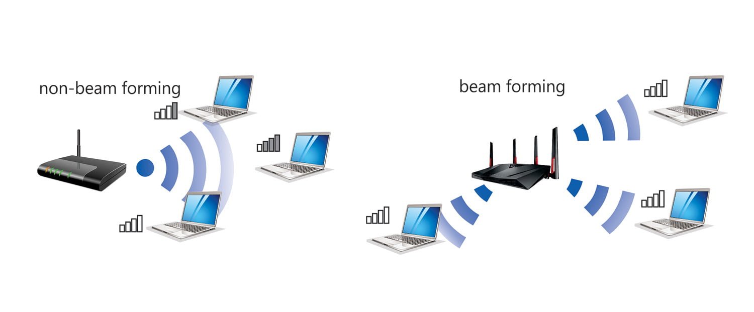 فناوری BeamForming که در دستگاه های با استاندارد AC مورد استفاده قرار می گیرد، سیگنال ها را به صورت جهت دارد ارسال می کند. ایسوس این فناوری را بهینه ساخته و دستگاه های موجود در شبکه AC، شناسایی شده و سیگنال ها به صورت جهت دار دریافت ارسال خواهند شد.