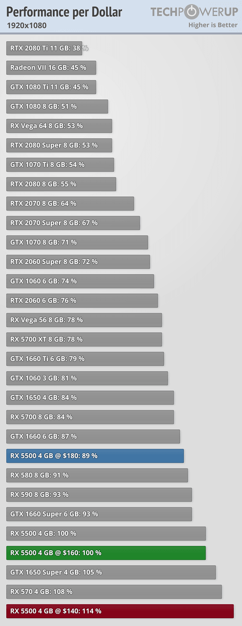 کارایی بر قیمت در حال حاضر براساس سه قیمت تعیین شده که هنوز هیچ کدام تایید نشدهاند. اگر AMD این کارت را 150 دلار قیمت گذاری کند، بنابراین GTX 1650 SUPER انتخاب بهتری خواهد بود اما AMD یک بار دیگر میتواند انویدیا را غافلگیر کرده و برچسب قیمتی RX 5500 را به 140 دلار تغییر دهد که آن را بین دو مدل بهترین خواهد کرد. انتظار داریم اخبار بیشتری طی روزهای آتی از سری Radeon RX 5500 و نمونههای سفارشی و همچنین مدل XT منتشر شود.