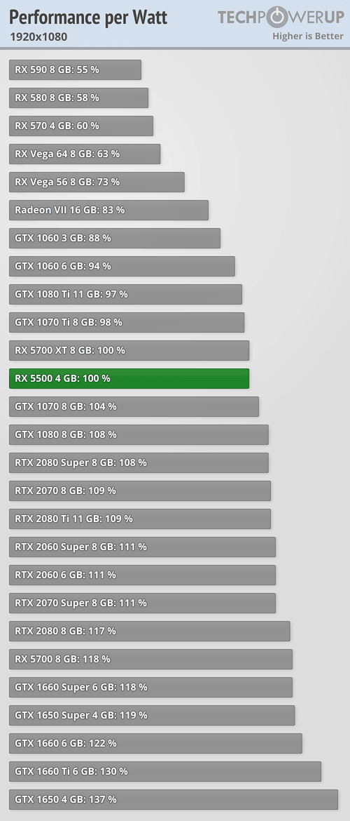 همانطور که مشاهده میکنید، AMD Radeon RX 5500 تقریبا عملکردی در حد Radeon RX 580 دارد و تنها 5 درصد از GeForce GTX 1650 SUPER ضعیفتر است در حالی که کاملا GTX 1650 را پشت سر میگذارد. البته که کارایی بر مصرف همچنان برای تیم سبز که از معماری 12 نانومتری تورینگ بهره میبرد بسیار بهتر است. با این حال کارت 7 نانومتری AMD Radeon RX 5500 موفق شده در این قسمت Radeon RX 580 را کاملا خُرد کرد، تقریبا دو برابر کارایی بر مصرف نسبت به معماری 12 نانومتری Polaris.