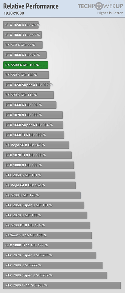 در مبحث قدرت خام، AMD به شکل رسمی کارت خود را در مقابل GeForce GTX 1650 قرار داده که 149 دلار قیمت داشته و از همین ماه با مدل GeForce GTX 1650 SUPER با قیمت 159 دلار جایگزین شده است. اعلام شده که این مدل 37 درصد سریعتر از GTX 1650 در برخی بازیها در وضوح 1080p میباشد. در بررسی Heise.de از یک نسخه OEM این مدل موفق شده در حد و اندازه یک Radeon RX 580 ظاهر شده در حالی که مصرف کمتری به همراه دارد. همچنین TechPowerUP نیز یک مدل OEM را در مقابل GeForce GTX 1650 SUPER تست کرده که تنها 5 درصد سریعتر بوده.