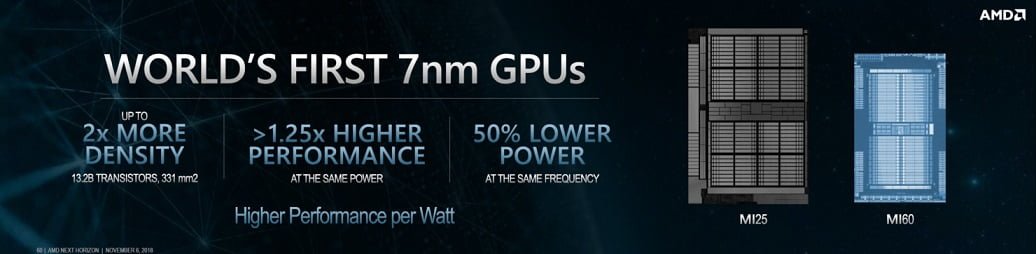 در مدل های “شتاب دهنده گرافیکی” مانند MI60، توان حرارتی تا 300 وات خواهد رسید؛ اما عجیب است که AMD از یک خنک کننده Passive Cooling بدون فن استفاده کرده است! تهویه این شتاب دهنده و یا کارت گرافیک، به خودی خود سوال برانگیز است. تعداد 4096 هسته پردازشگر جریانی در این سیلیکون به خدمت گرفته شده است. فرکانس حافظه نیز تا 500 مگاهرتز افزایش یافته است.