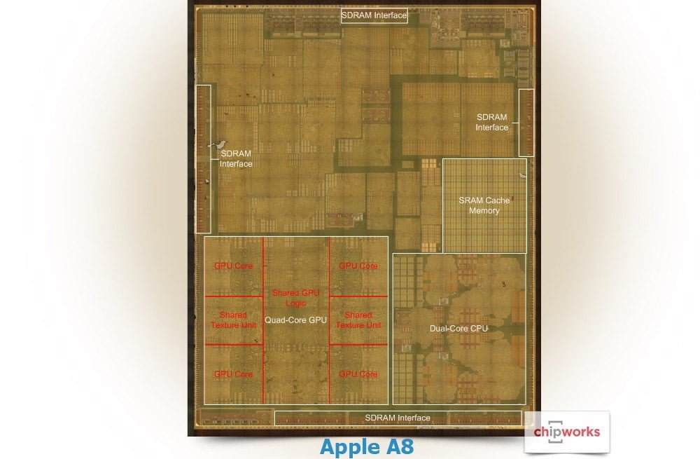 به روز رسانی: چیپ ست A8 دارای die با مساحت 89 میلی متر مربع بوده که در A9 افزایش یافته است. آن درسته از چیپ ست های A9 که توسط سامسونگ و با فرآیند 14 نانومتری ساخته شده اند، 96 میلی متر مربع بوده و دسته ای دیگر که TSMC با فرآیند 16 نانومتری ساخته، 104.5 میلی متر مربع هستند.