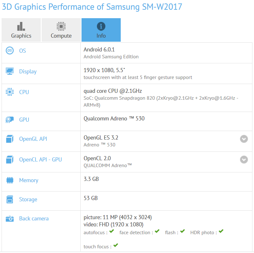 در نهایت SM-W2017 به دوربین اصلی 12 مگاپیکسلی و دوربین جلوی 5 مگاپیکسلی تجهیز خواهد شد. بر اساس اطلاعات درج شده در GFXBench، اندروید 6.0.1 بر روی این گوشی به طور پیشفرض نصب خواهد بود. پیش بینی میشود که سامسونگ ماه آینده از گوشی تاشوی پرچمدار خود در کشور چین با قیمتی معادل 1498 دلار رونمایی کند.