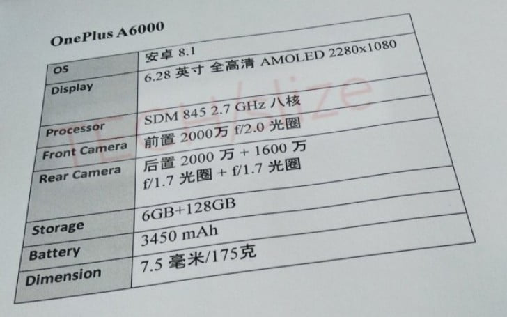 چند روز پیش تصویری منتسب به پرچمدار آینده وان پلاس منتشر شد که در آن عنوان شده بود این گوشی 749 دلار (610 یورو) قیمت خواهد داشت و حافظه داخلی آن 256 گیگابایت خواهد بود. امروز مشخصات بیشتری از جمله چیپ ست و حافظه رم و دوربین آن منتشر شده است.