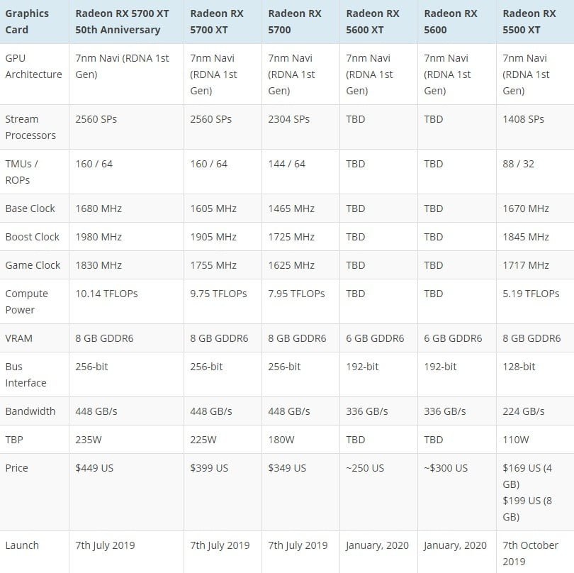بدین ترتیب RX 5600 نسخه استاندارد یا معمولی و RX 5600 XT نسخه قدرتمندتر از این سری از کارتهای AMD هستند و در حالی که RX 5600 XT از سرعت بالاتری نسبت به مدل معمولی برخوردار خواهد بود، RX 5600 کمی قیمت پائین تری نسبت به نسخه XT خواهد داشت. ضمن اینه AMD مدل RX 5600 را در دسترس مصرف کنندگان نیز خواهد گذاشت اما RX 5500، مدل پائین تر این خانواده در انحصار OEMها خواهد بود اما این مدل نسبت به RX 5500 XT تفاوتی در مشخصات فنی نخواهد داشت. از لحاظ عملکرد، اگر چه Radeon RX 5600 به پردازشگر گرافیکی Navi 14 مجهز می باشد اما عملکرد بهتری را نسبت به RX 5500 ارائه خواهد داد. با این حال در حال حاضر RX 5500 XT که با حافظه 8 گیگابایتی در دسترس است، بنابراین وجود 6 گیگابایت حافظه برای RX 5600 XT با وجود حافظه باس بیشتر و پهنای باند بالاتر باعث میشود این کارت دارای مشخصات بسیار عجیبی باشد.
