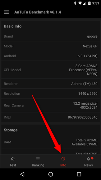 در ابتدا برای دریافت برخی اطلاعات پردازنده نرم افزار AnTuTu Benchmark از گوگل پلی به صورت رایگان دانلود و نصب نمایید. پس از نصب این نرم افزار و اجرای آن ، تب info در پایین صفحه را لمس نمایید.