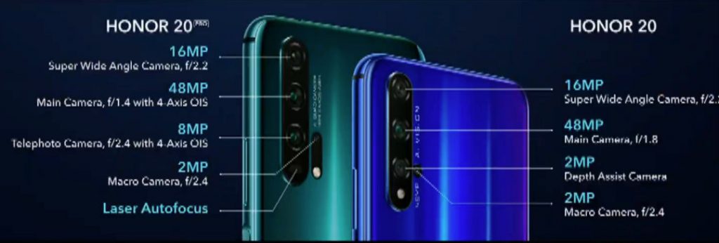 دوربین اصلی این گوشیها دارای سنسور 48 مگاپیکسلی IMX586 سونی است که از فناوری ترکیب پیکسلی 4 به 1 تحت عنوان Light Fusion بهره میبرد. HONOR 20 Pro برای اولین بار در جهان دارای لنزی با گشادگی دیافراگم f/1.4 است که در مقایسه با f/1.8 به میزان 50 درصد نور بیشتری جذب میکند. آنر 20 پرو همچنین دارای لرزشگیر اپتیکال 4 محوره در کنار لرزشگیر الکترونیکی و فوکس خودکار با تشخیص فاز و فوکس خودکار لیزری است. سنسور دوم این دوربین 14 مگاپیکسلی با لنز فوق عریض و میدان دید 117 درجه است، در حالیکه سنسور سوم 8 مگاپیکسلی با لنز تله و لرزشگیر اپتیکال 4 محوره میباشد که زوم 3 برابر اپتیکال و زوم 5 برابر هایبرید ارائه میدهد. علاوهبراین دوربین اصلی نسخه پرو دارای یک سنسور 2 مگاپیکسلی با لنز ماکرو نیز میباشد. در مراسم معرفی اعلام شد که این دوربین از سایت DxOMark امتیاز 111 را دریافت کرده است و در خبرهای تکمیلی به این موضوع بیشتر خواهیم پرداخت.