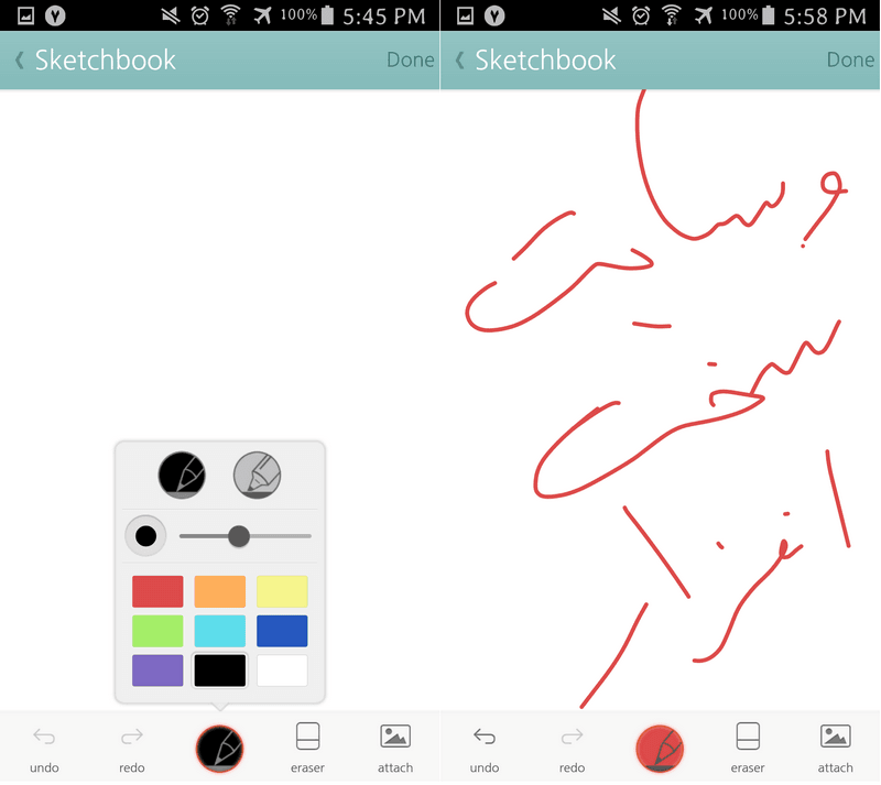 همانطور که گفتیم یکی از امکانات خوب این اپلیکیشن مربوط به این بخش است.شما در این بخش می توانید با دست خط خودتان یادداشت برداری کنید.می توانید رنگ و اندازه و نوع قلم را بسته به نوع نیاز خود تغییر دهید. اندازه پاک کن هم قابل تغییر است که می تواند در ظرافت پاک کردن بسیار تاثیرگذار باشد.Undo و Redo هم طوری طراحی شده اند که با فشردن آن ها فقط قسمت هایی که نیاز دارید به حالات قبل و بعد برمیگردند. با فشردن attach در همین بخش می توانید تصویر پس زمینه را عوض کنید.برای انتخاب تصویر پس زمینه می تواند از تصاویر خود اپلیکیشن بهره ببرید یا از گالری یا دوربین تلفن همراهتان استفاده کنید.
