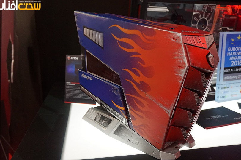 همچنین در این غرفه می توانید شاهد جدید ترین کامپیوترهای AIO از برند MSI باشید. اگر به یاد داشته باشید،MSI به تازگی تصاویری از یک کامپیوتر با طراحی منحصر به فرد را منتشر ساخت.مشخصات فنی Aegis X به طور کامل مشخص نیست اما،استفاده از پردازنده های سری K از اینتل و کارت گرافیک های پاسکال از انویدیا،مورد تائید است.در مدل های 19.6L شاهد استفاده از ذخیره ساز ها در قسمت پایین بدنه هستیم.منبع تغذیه (PSU) نیز تقریبا خارج از محیط اصلی است.یک دکمه اختصاصی Turbo برای آن در نظر گرفته شده است.در صورتی که کاربران نیاز به پرفورمنس بیشتر داشته باشند،با لمس این کلید،Aegis X تا 15% درصد به توان خروجی خود اضافه خواهد کرد.دو رابط مجزای HDMI در کنار آنها نسل جدید پورت های USB،در بخش هایی با دسترسی آسان نصب شده اند.هدف از این کار سهولت در بکارگیری واقعیت مجازی است.
