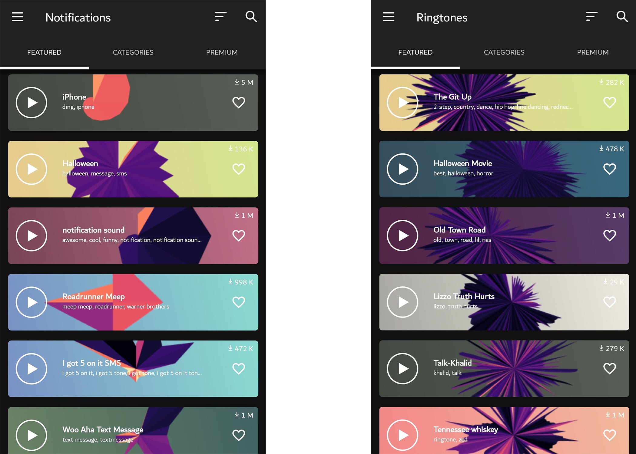 بخش بعدی که با آن زیاد سر کار داریم رینگتون یا همان صدای زنگ است که Zedge این بخش را نیز تحت پوشش خودش قرار داده است و شما میتوانید به منبع وسیعی از رینگتون دسترسی داشته باشید. بعد از زدن گزینه Ringtones از بخش منوی همبرگری میتوانید با زدن بر روی آیکون Play رینگتون مورد نظرتان را گوش کنید و در صورت علاقه مندی آن را برای زنگ هشدار یا زنگ تلفن خود تنظیم کنید. همچنین مثل تصویر زمینه، در صورت زدن بر روی موزیک مورد نظر وارد بخش اصلی آن میشوید که برای شما گزینه Set ، Share و favorite را میآورد که طرز کار هر یک را گفتیم.