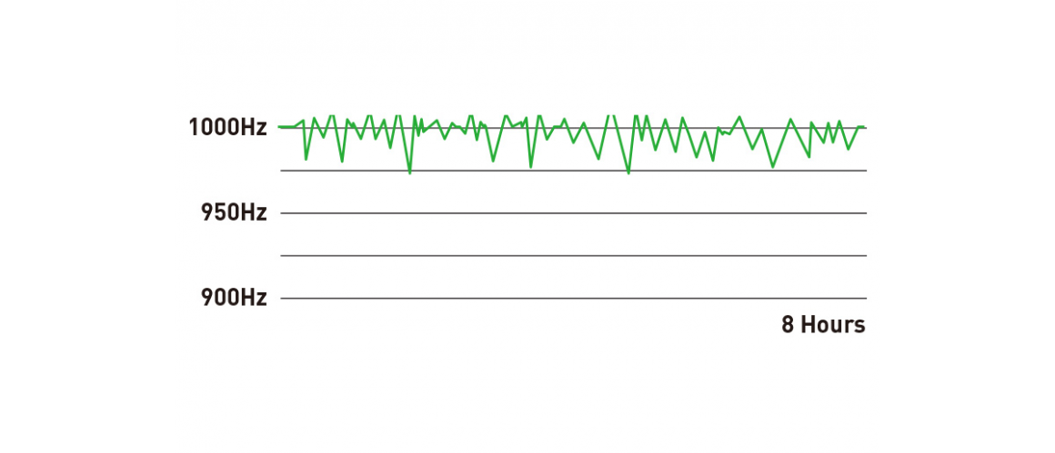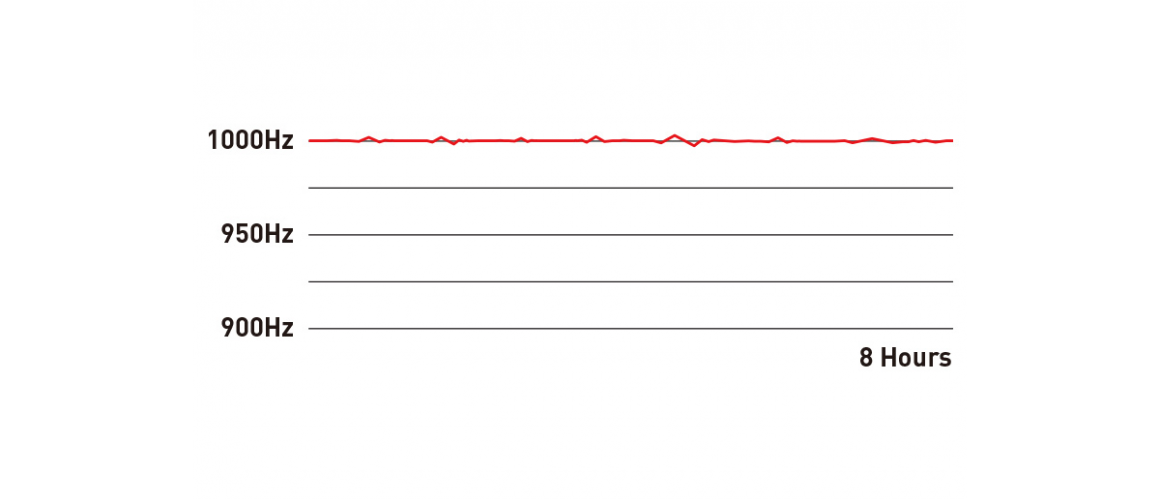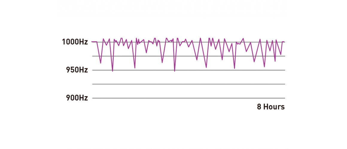 MSI موس وایرلس گیمینگ خود را برای مدت زمان طولانی و به مدت 8 ساعت در یک محیط شلوغ مورد آزمایش قرار داده و نتیجه جالبی دریافت کرده است. در طول این ساعت، فرکانس موس بر روی 1000 هرتز ثابت بوده و نوسانها بسیار کم و ناچیز بوده است. در صورتی که تست موس وایرلس از برندی دیگر، نشان از نوسانهای زیاد و قابل توجه در فرکانس 1000 هرتز دارند. بدین ترتیب اتصالی ناپایدار داشته است. در همان محیط تست MSI، موسی با یک برند دیگر آزمایش شده و تا 50 هزتر نیز افت فرکانس داشته است.