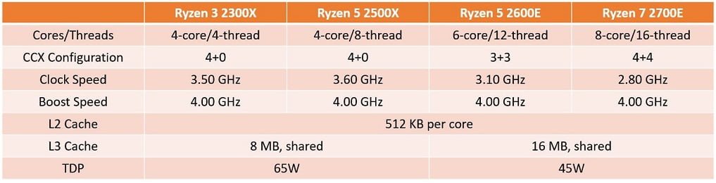 بر خلاف سیلیکون های Summit Ridge که از آرایش CCX با CCX (2+2 CCX) هستند، معماری های مشابه Pinnacle Ridge دارای آرایش 4+0 در CCX است. همچنین در توسعه سری E نیز شاهد پردازنده های جدید با نام Ryzen 5 2600E و Ryzen 7 2700E هستیم. توان حرارتی این سری به 45 وات می رسد که برای کاربردهای سازمانی و اداری نیز مناسب هستند. در آنها از 6 و 8 هسته به همراه ویژگی HT استفاده می شود.