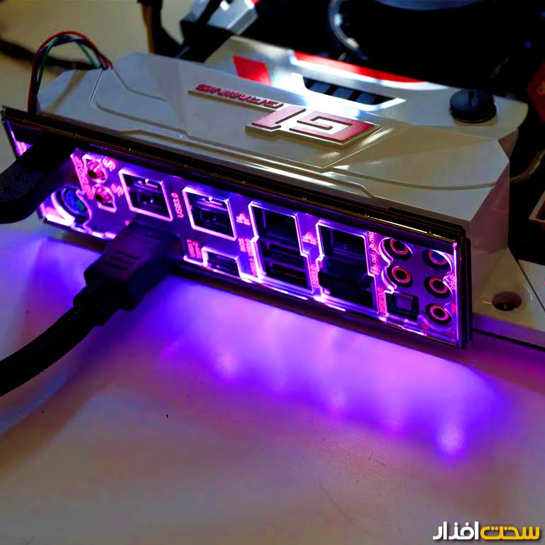 در سمت چپ مادربرد و در زیر قاب محافظ پلاستیکی، پورت مخصوص اتصال موس و کیبوردهای قدیمی، 4 پورت USB 3 به رنگ مشکی که یکی از این پورتها برای فلش کردن یا آپدیت کردن بایوس دستگاه استفاده میشود، دکمه سیاه رنگ بایوس (برای آپدیت کردن بایوس مادربرد، فایل مورد نظر را از سایت شرکت دانلود کرده و درون USB قرار میدهید و در زمان اتصال USB به دستگاه این دکمه را چند ثانیه نگاه میدارید تا چراغ مورد نظر شروع به چشمک زدن کند و بعد از مدتی دستگاه شما آپدیت شده است و میتوانید از امکانات جدید بایوس استفاده کنید)، 2 پورت USB 3.1 که یکی با رنگ قرمز (Type-A) و دیگری به رنگ مشکی (Type-C)، پورت LAN و پورت HDMI و Displayport که از گرافیک پردازنده به عنوان پخش تصویر استفاده میکنند میتوانند در حداکثر دقت 2160×4096 به مقدار 24 هرتز در پورت HDMI و دقت 2304×4096 به مقدار 60 هرتز در پورت Displaybort تصویر را روی صفحه نمایش پخش کنند، دیده میشود (تصویر 6).