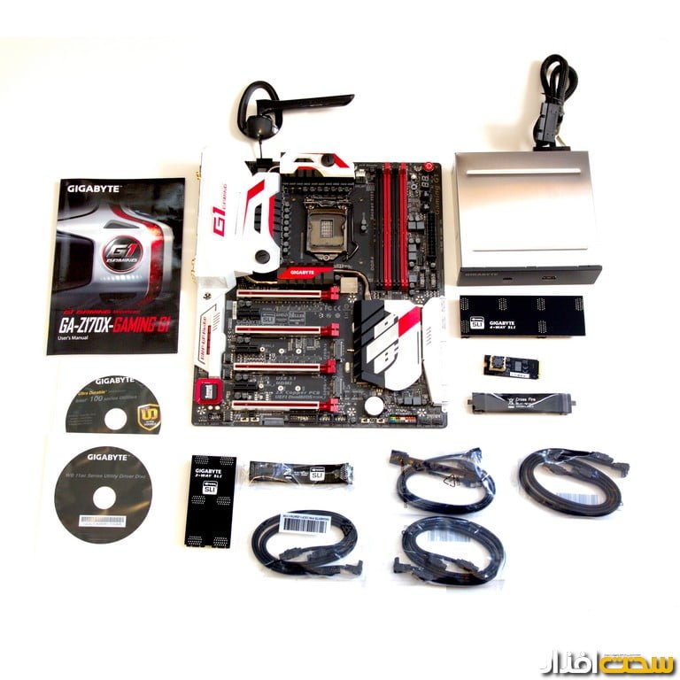 برای حفاظت از تخلیه بار الکترواستاتیکی برای این مادربرد تکنولوژی ESD در نظر گرفته شده است که به منظور افزایش دوام و طول عمر مادربرد بسیار ضروری است. در قسمت بایوس مادربرد شاهد رابط کاربری هستیم که سعی در آسان کردن استفاده از قسمتهای مختلف برای کاربر صورت گرفته است و پوسته ظاهری جذابی را در این قسمت شاهد هستیم. کاربر در این قسمت میتواند از ریزترین جزئیات قطعات مطلع و در صورت تمایل برای تغییرات در کارآیی آنها اقدام کند و به راحتی اقدام به آپدیت بایوس دستگاه کند. برای بازیهای آنلاین در CLAYMORE از تکنولوژی Realtek Gaming Ethernet استفاده شده است که طبق ادعای شرکت سریع تر و هوشمند تر به این مبحث میپردازد (تشخیص خودکار هر برنامه و پردازش آن برای برقرای سریع ارتباط و زمان تاخیر کم در این بازیها). سرعت انتقال دادهها در این مادربرد به صورت استاندارد در M.2 و SATA Express به مقدار 16Gb/s و در USB 3.1 به مقدار 10Gb/s است. برای اورکلاک پردازنده در این مادربرد از تکنولوژی LEET Boost استفاده شده است که نسبت به تکنولوژی اینتل (INTEL Turbo Boost) به مقدار 122 درصد ارتقا پیدا کرده است و کاربر میتواند در کمترین زمان فرکانس پردازنده را بالا ببرد و ازامتیازات بالا و اجرای بهتر بازیها لذت ببرد. در این محصول در بخش صدا شاهد کارت صدای Realtek ALC1150 هستیم که صدایی رسا و شفافی را برای شنیدن کاربران فراهم میکند. محیط نرم افزار صدا مناسب است و می توان از امکانات آن به سادگی استفاده کرد و با تغییرات از صدای پخش شده لذت برد. از نرم افزارهای استفاده شده در این مادربرد می توان به eSF(برای کنترل فنها)، eDLU(برای آپدیت درایورها) و eBLU(برای آپدیت بایوس) اشاره کرد. خلوتترین و کوچکترین جعبه را در میان مادربردهای حاضر در بررسی این محصول دارد. وسایل موجود در مادربرد شامل دفترچه راهنما، 4 کابل SATA، سی دی درایور مادربرد، پنل I/O و خود مادربرد است که در صورت استفاده از چند گرافیک، پلهای ارتباطی را کاربر باید تهیه کند (تصویر 28).