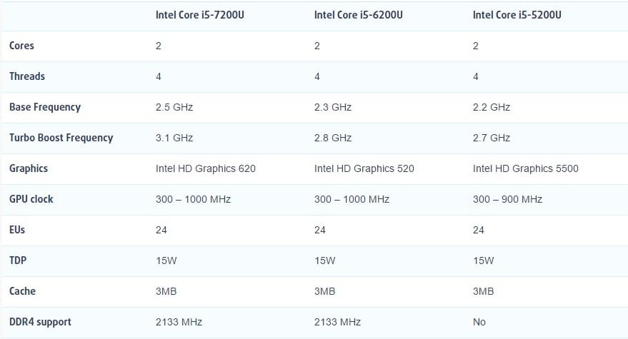 در ساختار اصلی این پردازنده ها (تعداد هسته و رشته های پردازشی) تفاوتی وجود ندارد. همگی آنها از 2 هسته و 4 رشته واقعی برخوردار هستند. جدول زیر به خوبی مشخصات این پردازنده ها را در کنار یکدیگر نمایش خواهد داد: