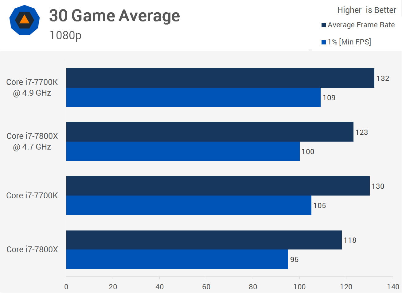 فرکانس پایه در Intel Core i7-7700K تا 700 مگاهرتز بیش از Core i7-7800X است (4.2 گیگاهرتز در برابر 3.5 گیگاهرتز) همچنین در فرکانس افزایشی نیز i7-7700K با فرکانس 4.5 گیگاهرتز در برابر 4 گیگاهرتز رقیب قرار دارد. علاوه بر نرخ فریم (FPS)، مصرف انرژی نیز در این دو CPU مقایسه شده است. بدیهی است که Core i7-7800X با تعداد هسته های بیشتر، از توان مصرفی و حرارتی بیشتری برخوردار است. این مقایسه ثابت می کند که اینتل به طور واضح پردازنده های مصرف کننده را از مدل های رندرینگ جدا کرده است و البته این مسئله نشان می دهد که بازی های امروز با پردازنده های 4 هسته ای بهینه تر خواهند بود. در نتیجه در صورتی که خواهان خرید یک سیستم مخصوص بازی هستید، نیازی به تهیه پردازنده های گران قیمت Core-X ندارید.
