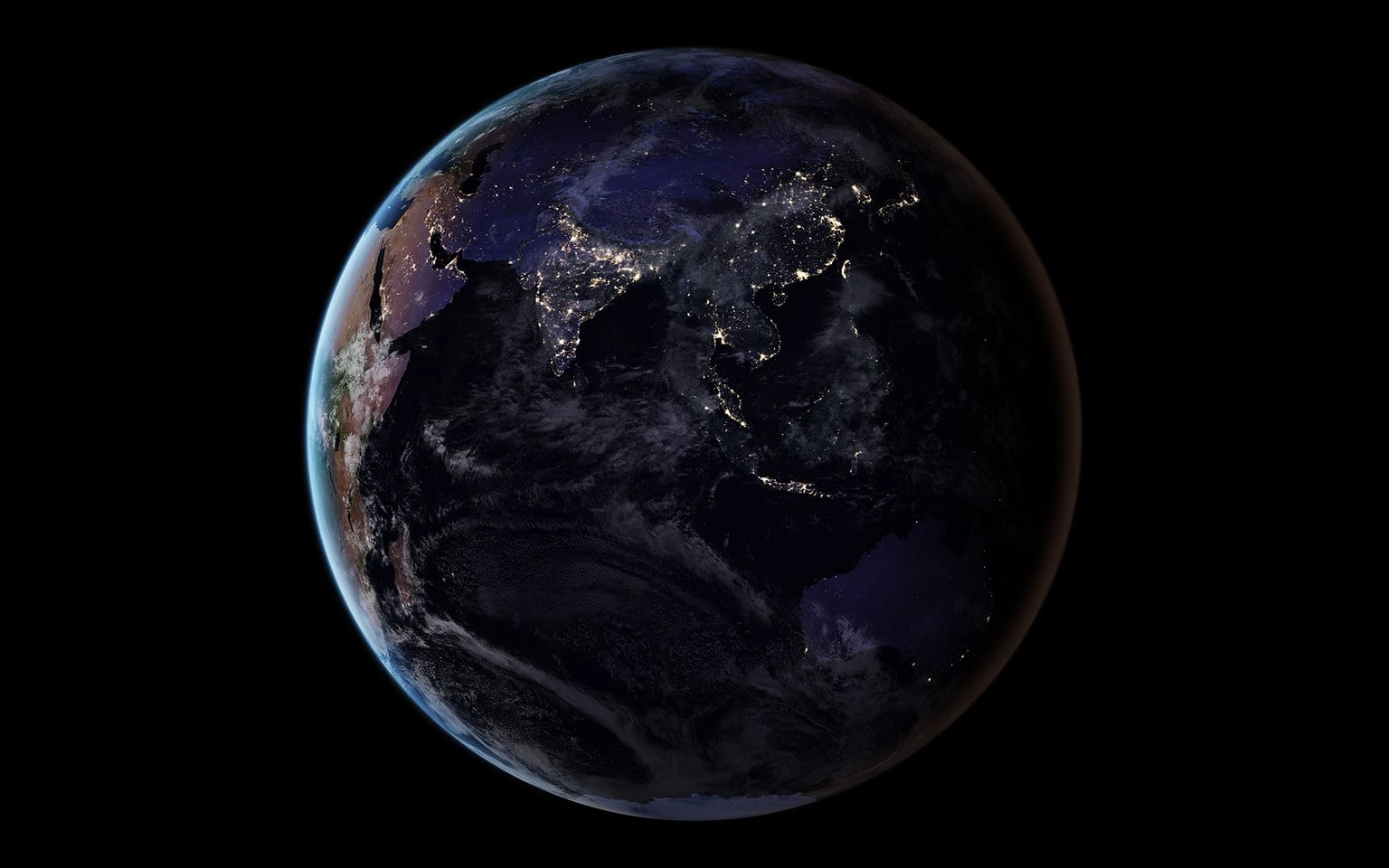 این تصویر ترکیبی تمام نیمکره زمین را در شب نشان میدهد. ابرها و درخشش خورشید از سمت سطح زمین و پوشش ابرها اضافه شده است. (ناسا)