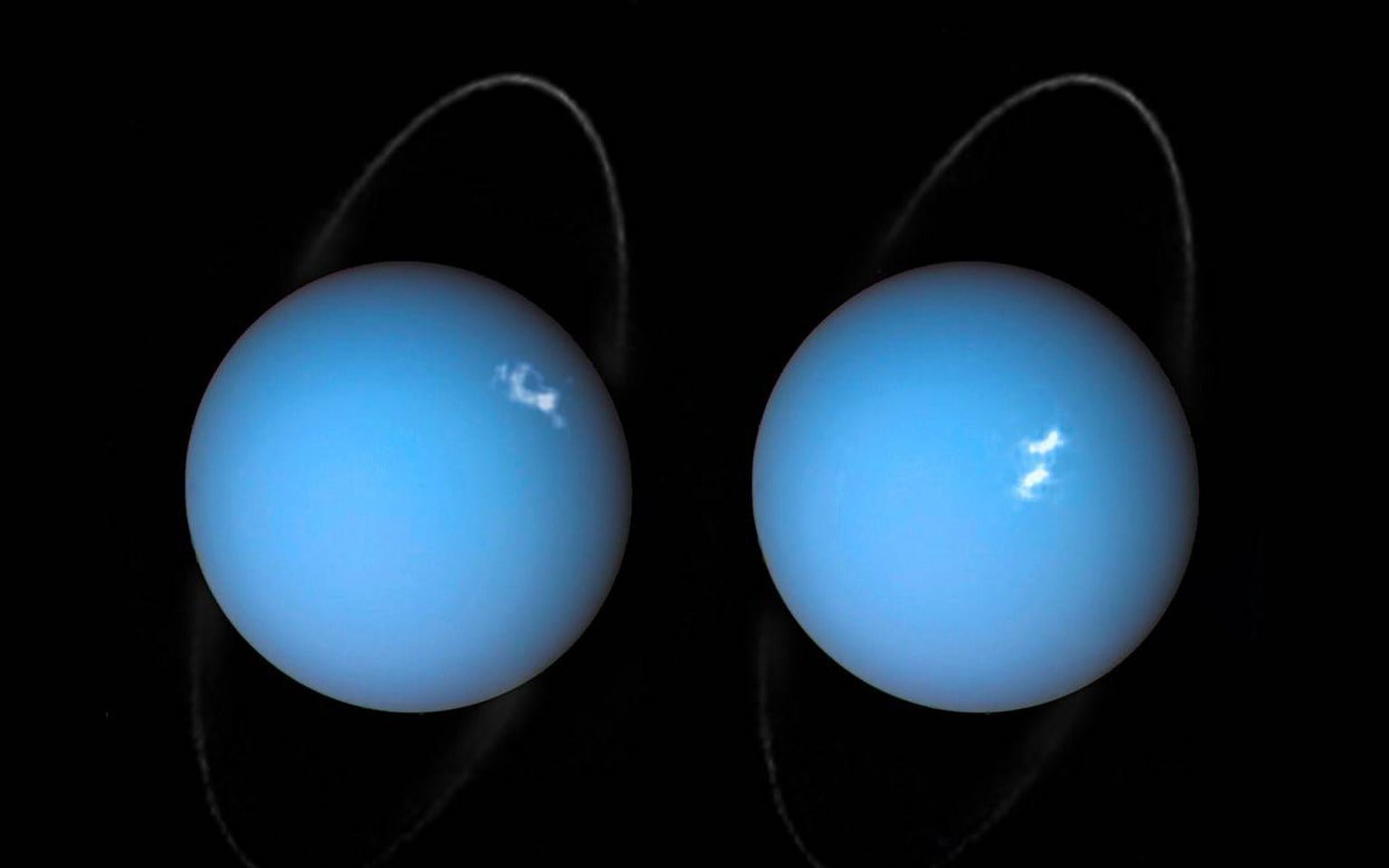 این تصویر ترکیبی از اورانوس، توسط وویجر 2 و هابل شفق قدرتمند این سیاره یخی گرفته شده است. آنها توسط نهری از ذرات باردار از باد خورشیدی، در معرض انفجار عظیمی از نور در جو زمین قرار گرفتند. (ناسا)