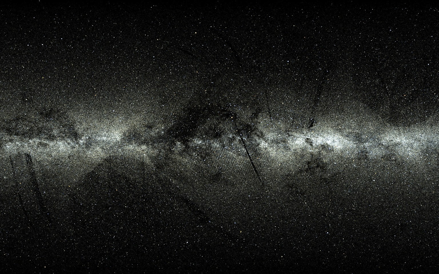 در این تصویر کهکشان ما، کهکشان راه شیری در باند افقی، متراکم با ستارگان است. در سمت چپ دو خوشه باز از ستارگان وجود دارد که با هم به دنیا آمده اند و همچنان با یکدیگر حرکت می کنند. (ESA)