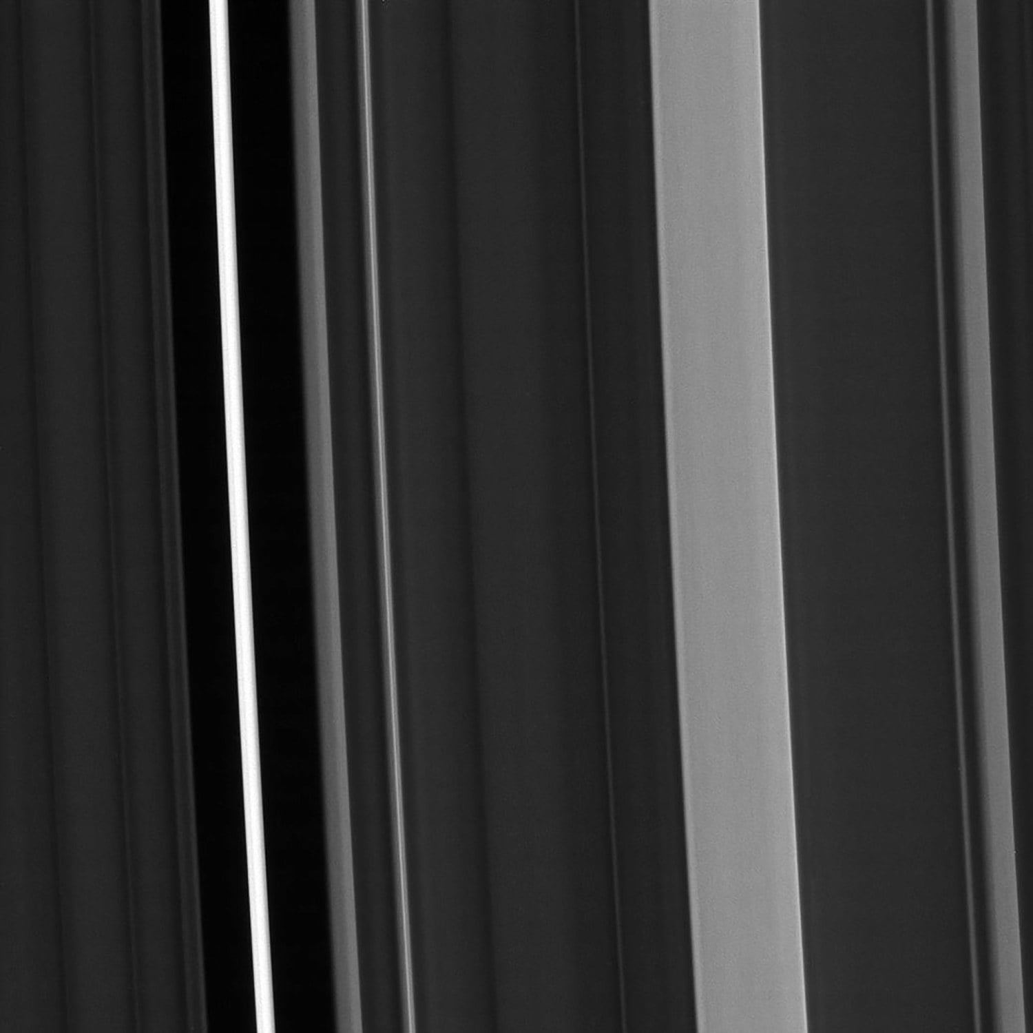 در این تصویر از حلقه C زحل که از فاصله 313 کیلومتری از آن گرفته شده است، مناطق روشن تر فلات (plateaus) نام دارند، در حالیکه مناطقی که عاری از نور است را شکاف (gap) می نامند. (ناسا)