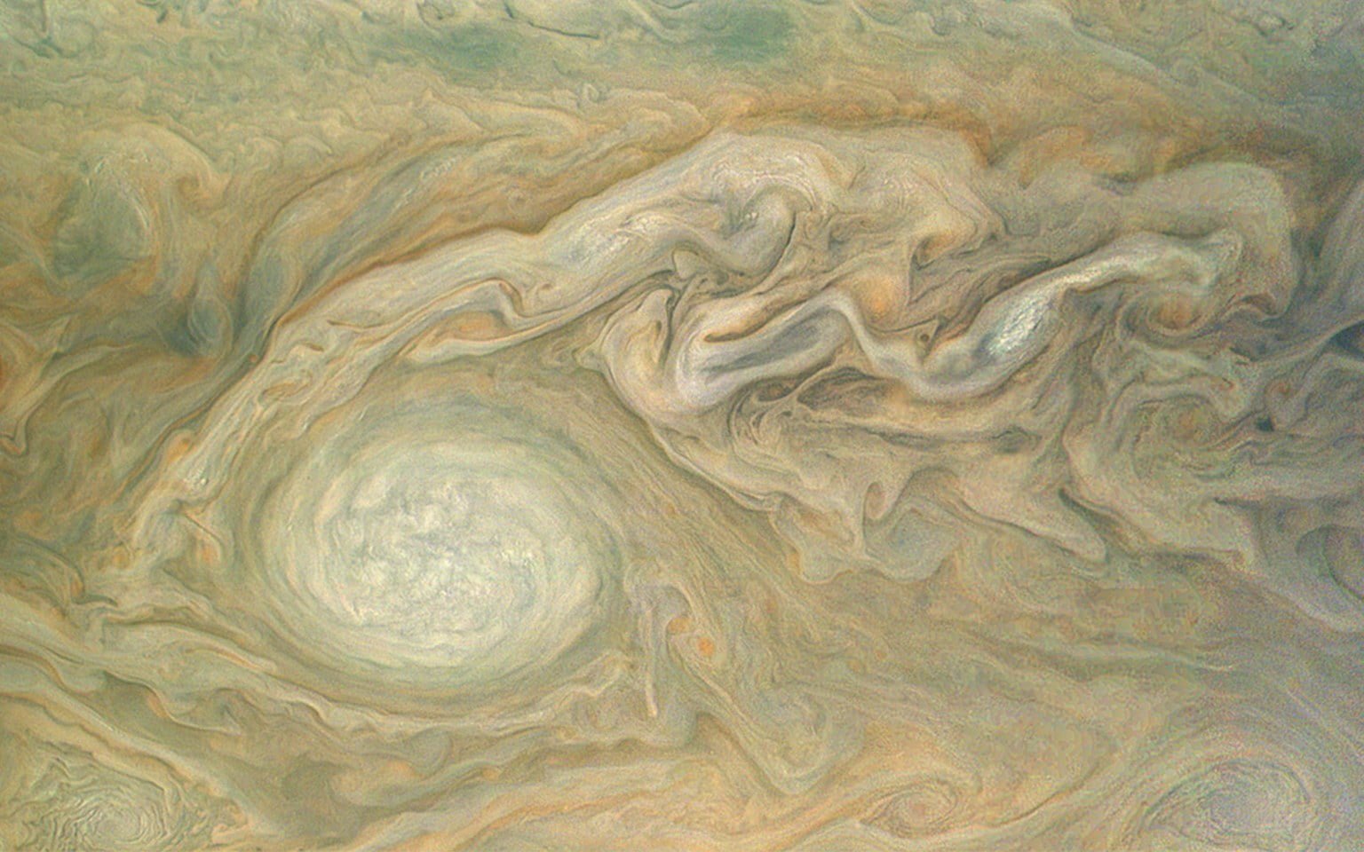 این تصویر که رنگ های آن افزایش یافته است ابرهای بالای سیاره مشتری در نیمکره جنوبی آن را نشان میدهد. (ناسا)