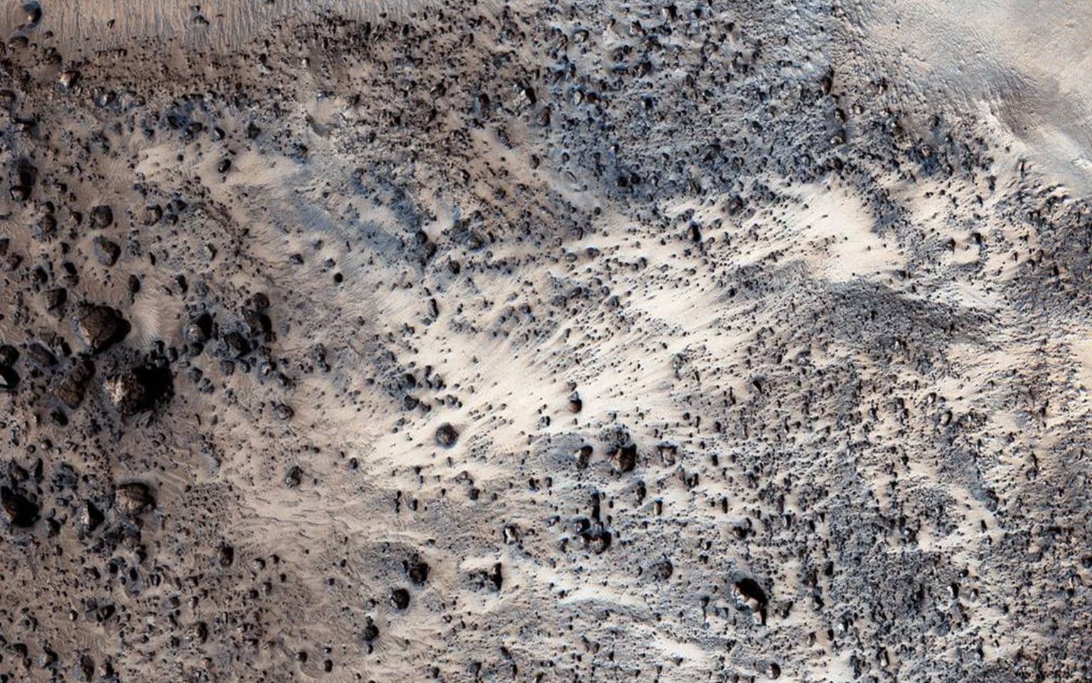 این تصویر توسط مدارگرد اکتشافی مریخ (Mars Reconnaissance Orbiter) که متعلق به ناسا است گرفته شده و ریز خاک و نشست صخره ای را در Simud Valles نشان میدهد. سیموند والس کانالی در مریخ است که توسط سیل های بسیار قدیمی شکل گرفته است. (ناسا)