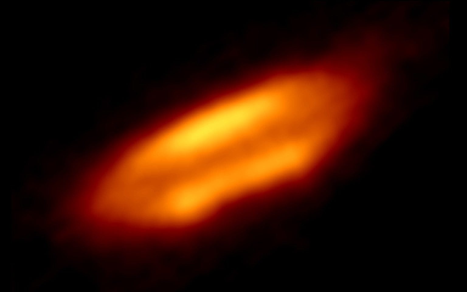 این تصویر یک ستاره تازه متولد شده است که گرد و غبار آن را احاطه کرده اند. این ستاره که توسط تلسکوپ آلما در آتاکاما شکار شده است، تنها 40,000 سال سن دارد و همانند ستارگان کم جرم به طور متوسط 100 میلیارد سال زندگی میکند. (آلما)