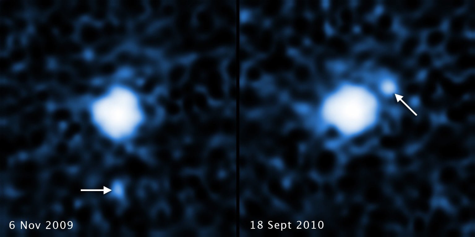 آرشیو تصاویر هابل، این عکس ها را با فاصله زمانی یک سال گرفته است که نشان میدهد که ماه در حال چرخش به دور 2007 OR10، سومین سیاره کوتوله در منظومه شمسی ما است. این سیاره در کمربند کویپر واقع شده است. (ناسا)