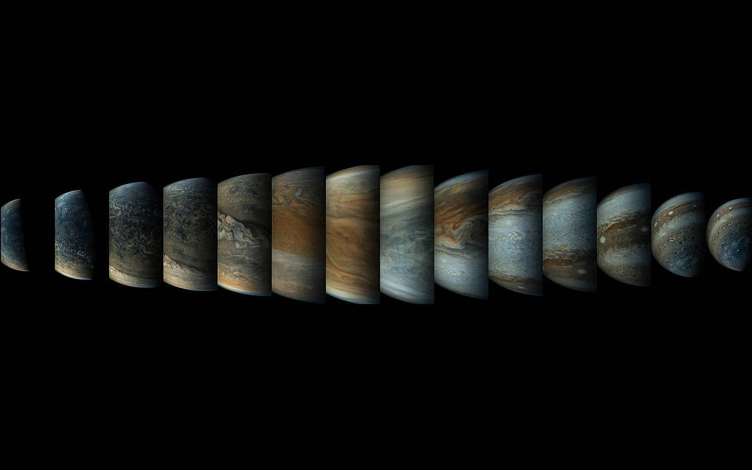 هر 35 روز یکبار، فضاپیمای جونو در سفر 2 ساعتهی خود سراسر قطب شمال و جنوب مشتری را می پیماید. مجموعه این 14 عکس که رنگ آنها بصورت مصنوعی افزایش یافته است، نتایج این سفرها را نشان میدهد. (ناسا)