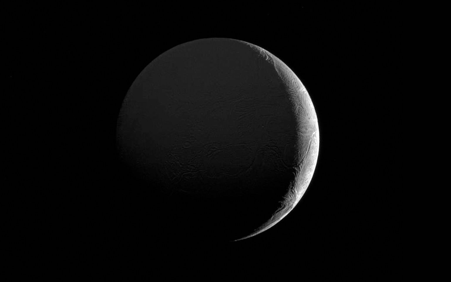 این تصویر از انسلادوس، یکی از قمرهای زحل، نور خورشید در امتداد لبه هلال پشته یخی سرد، خود را نشان میدهد. این تصویر توسط فضاپیمای کاسینی از فاصله 168,000