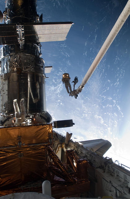 تصویری از Steven Smith در حالی که در انتهای شاتل فضایی در حال عملیات تعویض قطعات است.