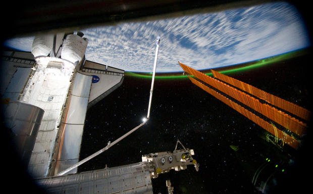 در این تصویر پانوراما شما قادر به مشاهده شاتل فضایی آتلانتیس در جلوی صفحات خورشیدی ISS و در پس زمینه آن زمین به خوبی به همراه نورهای جنوبگان قابل مشاهده است.