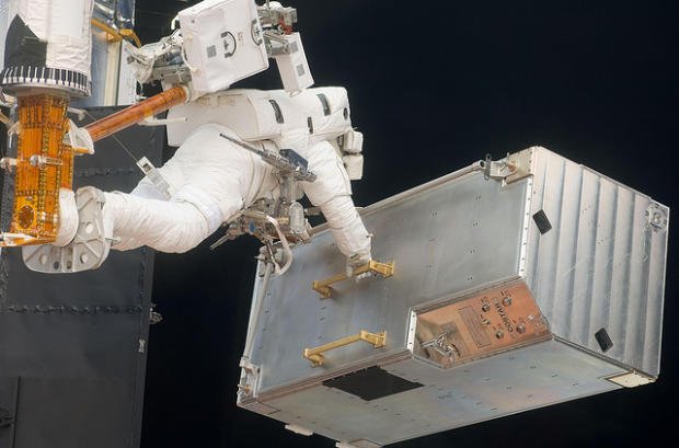 تصویری از Steven Smith در حالی که در انتهای شاتل فضایی در حال عملیات تعویض قطعات است.