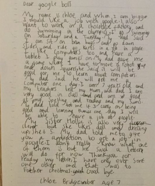 در بخشی از این نامه این کودک که کلویی نام دارد اشاره می کند که تا کنون تنها 2 نامه نوشته که یکی از آنها به بابانوئل و دیگری به “رییس گوگل” (که نامش را هم نمی داند) بوده. کلویی عنوان کرده که دوست دارد در آینده علاوه بر کار کردن در گوگل در یک کارخانه شکلات سازی هم کار کند و همچنین در رشته شنا در المپیک مسابقه دهد. کلویی به “رییس گوگل” می گوید که به کامپیوترها خیلی علاقه دارد و به همین دلیل پدرش برای او یک تبلت خریده و قول داده اگر او در مدرسه عملکرد خوبی داشته باشد در آینده یک کامپیوتر نیز برایش بخرد.
